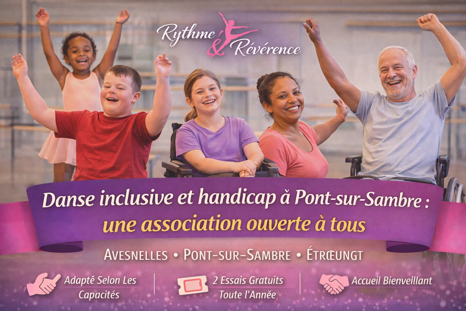 Notre association de danse inclusive à Pont-sur-Sambre accueille enfants, adolescents et adultes dans un cadre respectueux, bienveillant et adapté aux capacités de chacun.